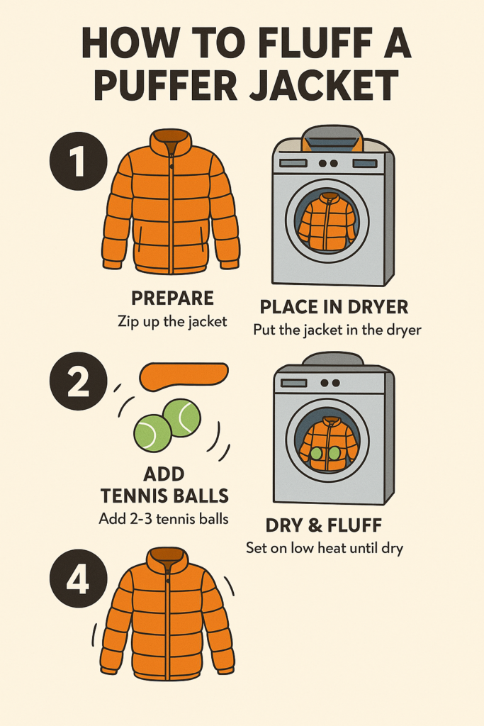 To fluff down a jacket in the dryer, first, make sure that the jacket is clean and free of any debris. Next, put the jacket in the dryer on a low heat setting with a few round objects (like tennis balls) to beat the clumps apart.